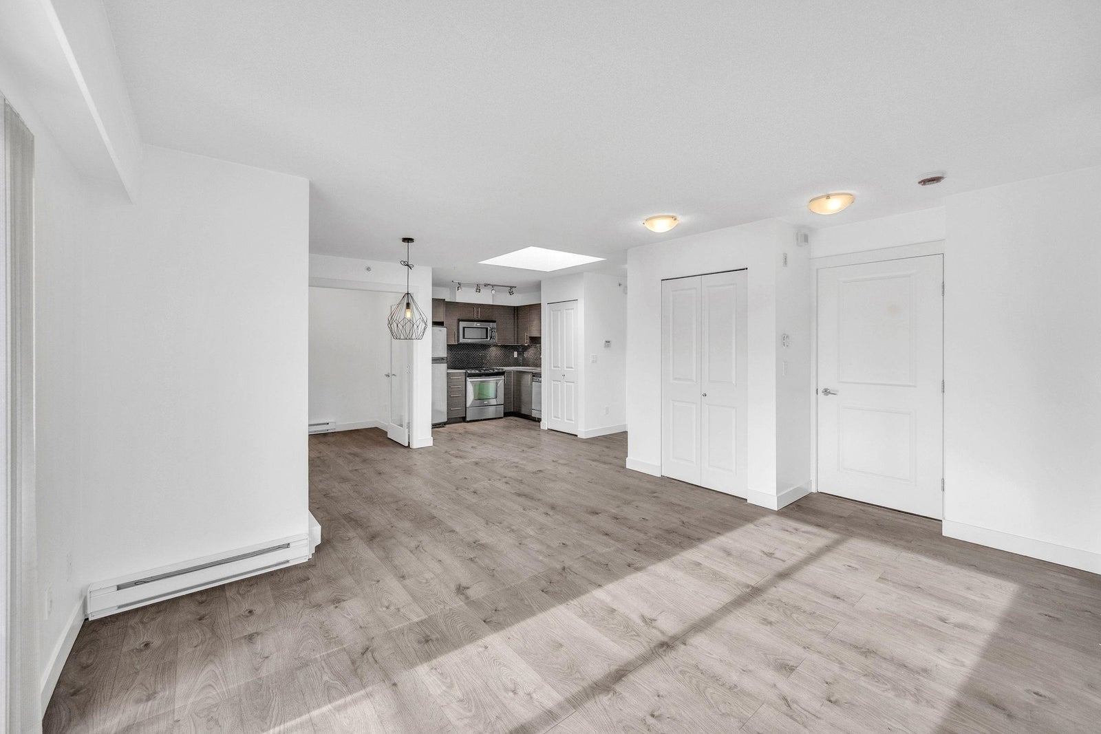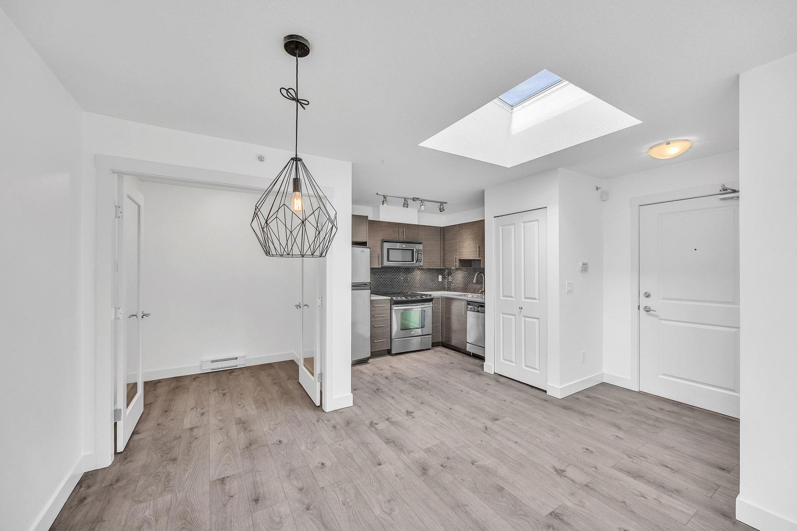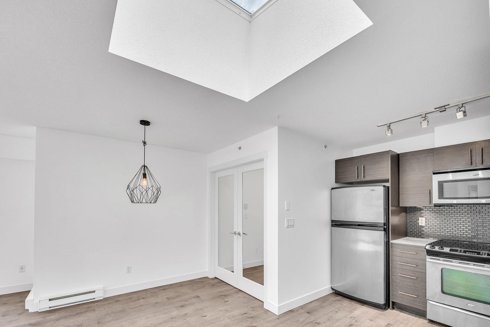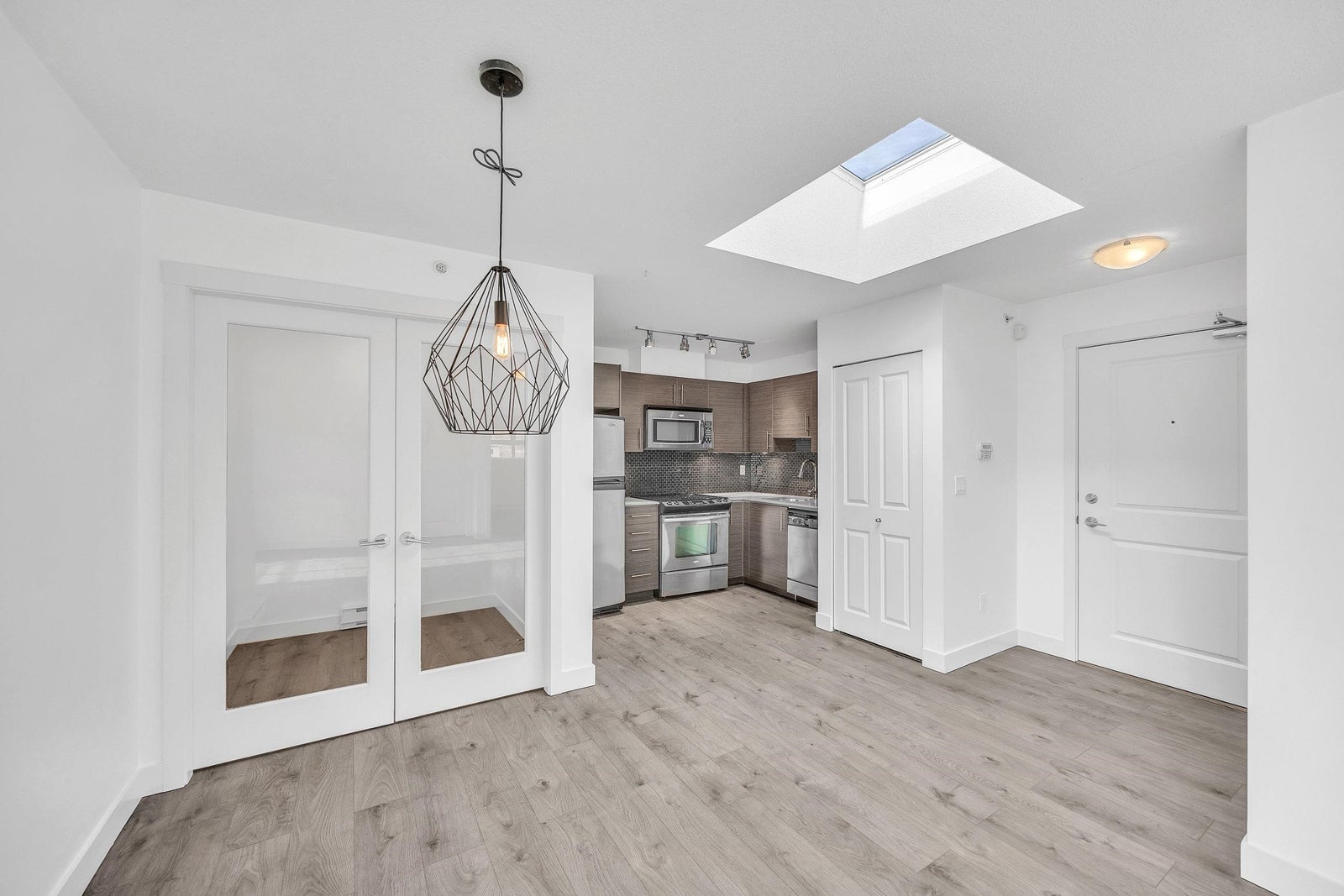 A rare find & incredible value in this top-floor retreat! This bright, south-facing corner suite welcomes you with space, light & modern comfort from the moment you arrive. Nearly 700 sqft of stylish living features ss appliances, stone countertops, new flooring & a sleek glass-tiled backsplash. Beautiful French doors open to a flexible den, ideal for a home office or creative space, while a large skylight fills the kitchen, living & entryway with natural light. Enjoy a private patio overlooking Shelley Park, quietly around the corner from the vibrant energy of Commercial Drive's cafés, restaurants, shopping & SkyTrain access all at your doorstep. Generous in-suite storage, secure parking & bike locker, this standout opportunity priced below assessed value. Open Sun 12-2pm (Nov.23rd)